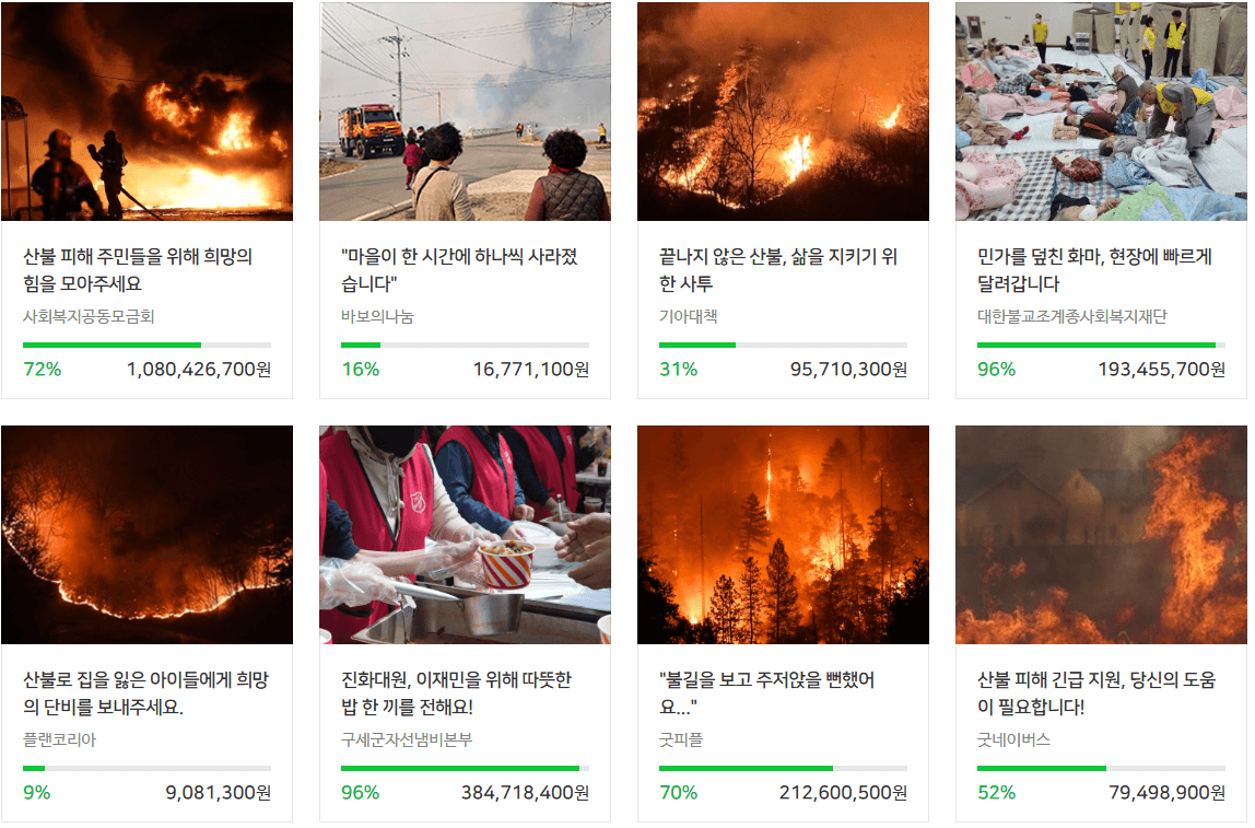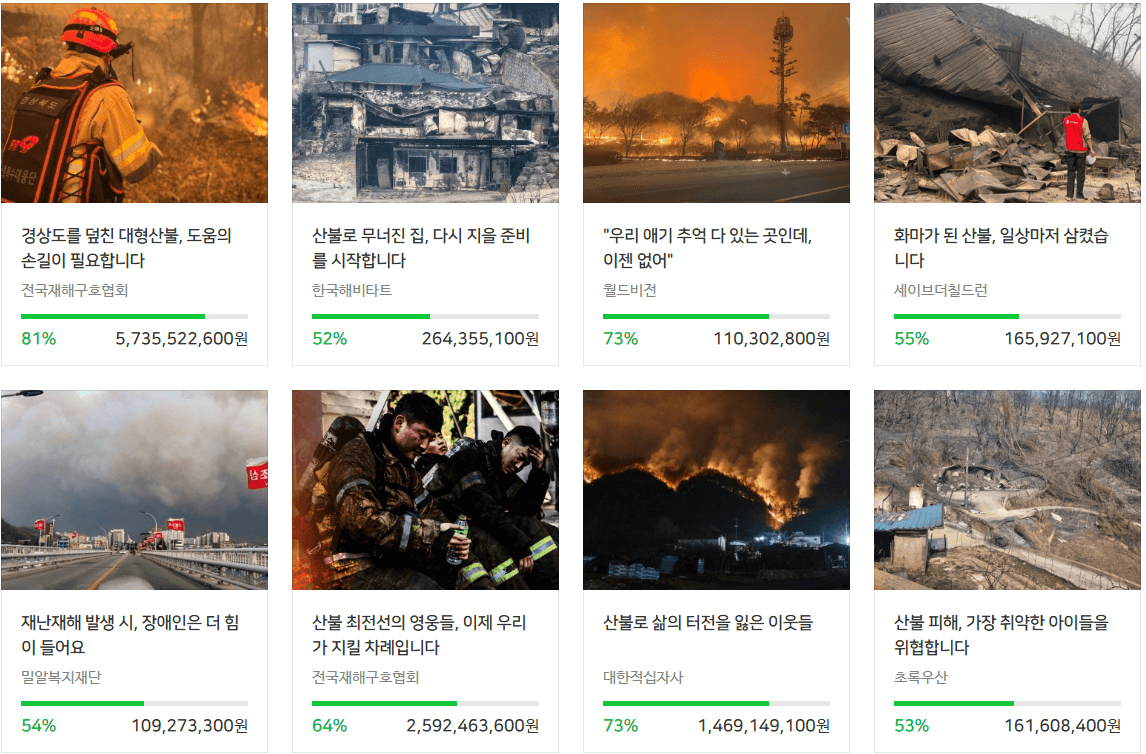 - 방법: 사이트 접속 → 산불 피해 모금함 검색 → 응원 댓글 작성(1건당 100~1,000원 기부) → 직접 기부도 가능(카카오페이 등).