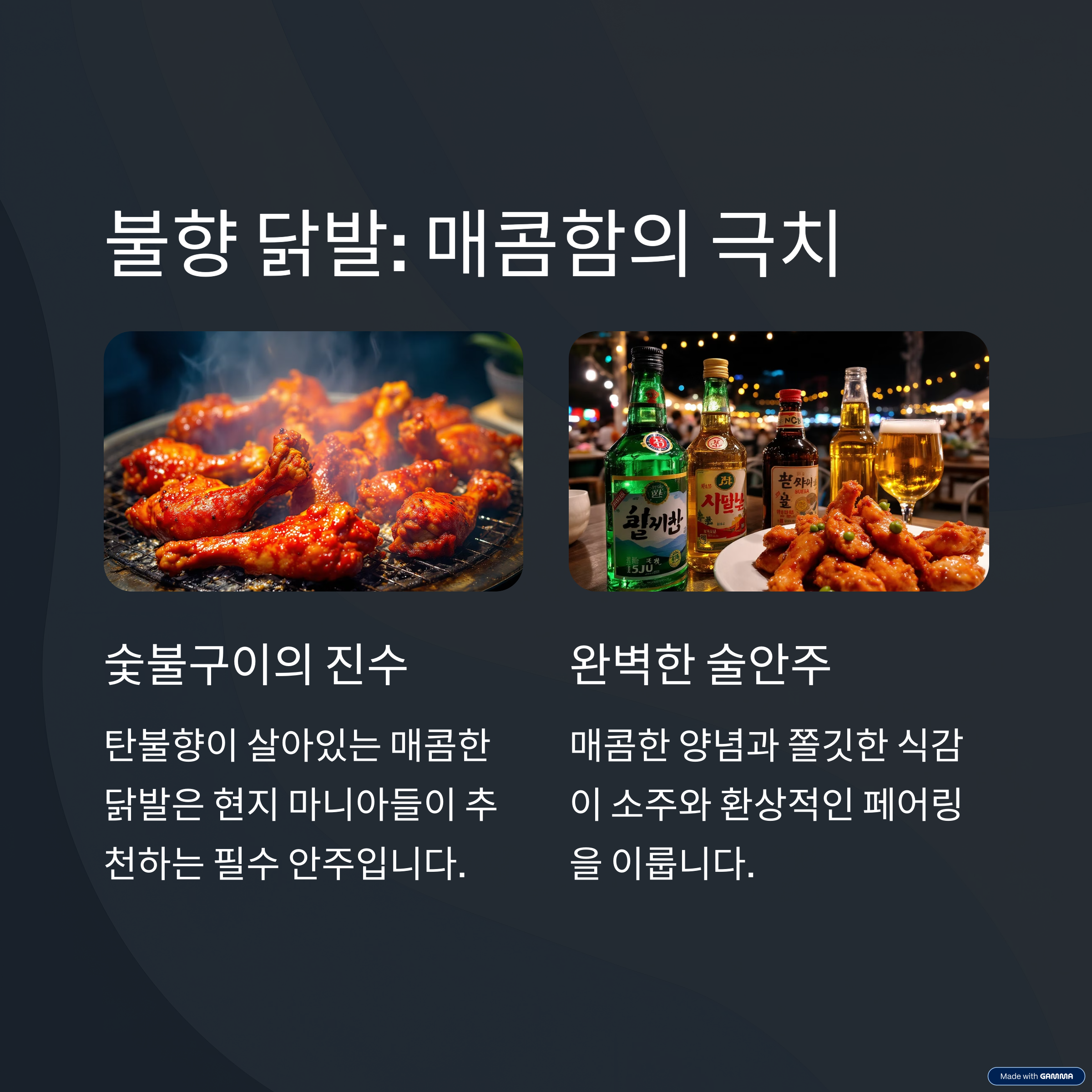 직화 불향이 제대로 배인 매콤한 닭발은 술이 술술 들어가는 최고의 안주예요. 맵지만 중독성 있는 맛 덕분에 한 번 먹기 시작하면 멈추기 어려워요. 쫄깃한 식감에 매운 양념이 어우러져 스트레스까지 확 날려줍니다.