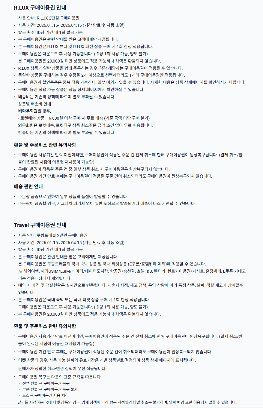 - 여행·알럭스 쿠폰은 추가 결제 없이는 쓰기 애매