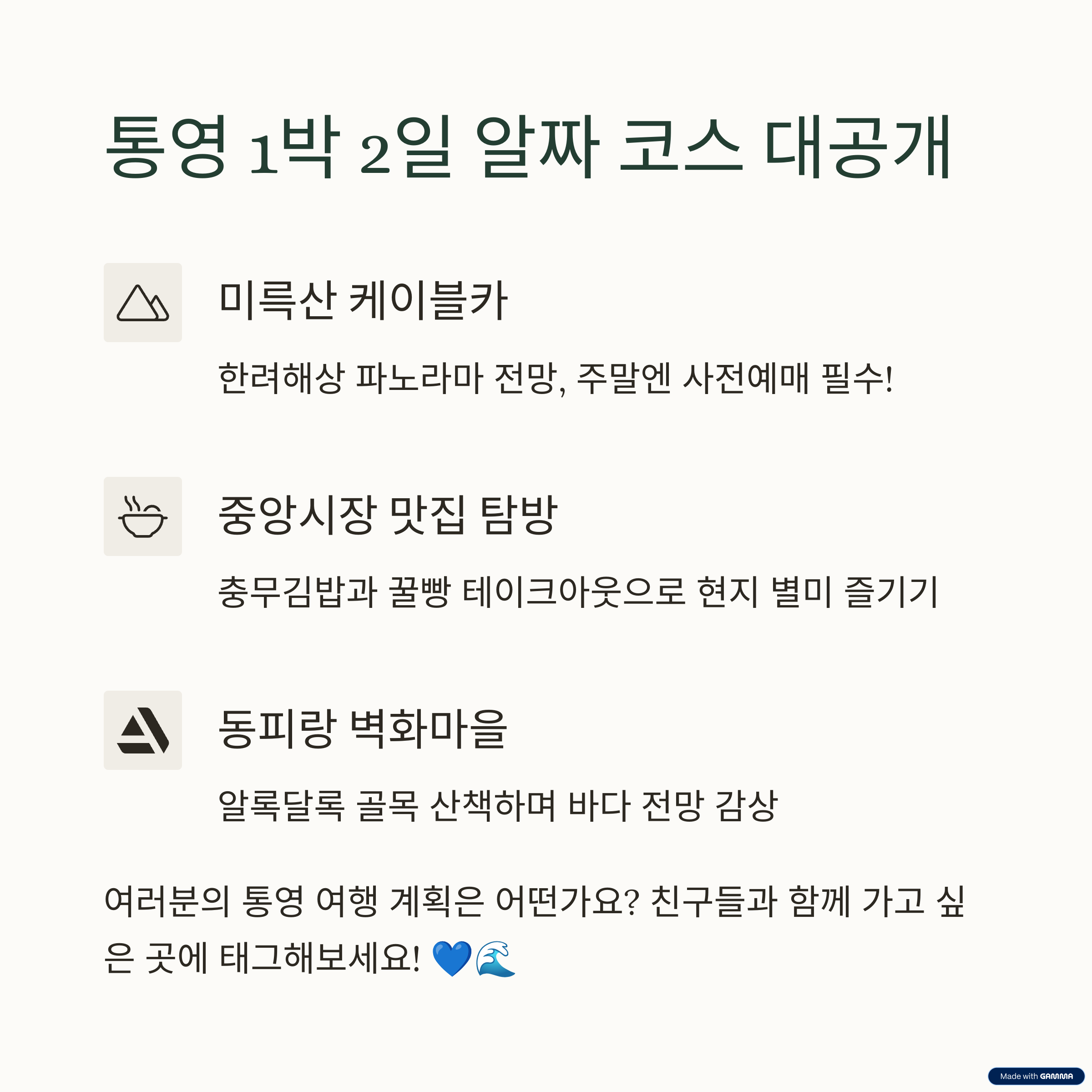 자연, 예술, 액티비티, 먹거리까지 모두 갖춘 통영은 여행의 모든 요소를 만족시켜 줄 것입니다. 이 가이드만 따라가도 실패 없는 여행이 될 거예요 😊
